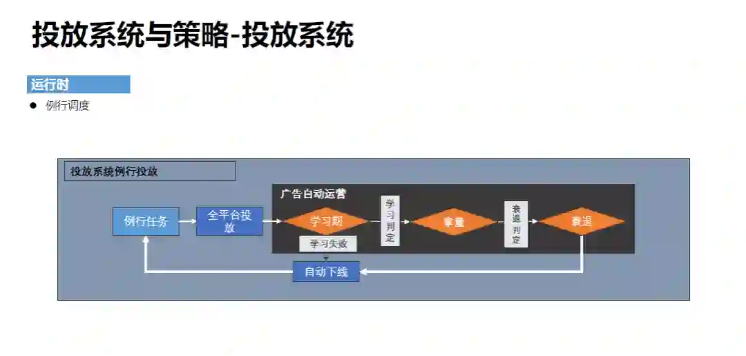 简单介绍下投放引擎在管理线上所有广告时的生命周期策略。当例行任务把全平台的广告投放出去,广告在投放平台中的运行周期主要分三个:学习期,稳定拿量期,衰退期。投放引擎会根据后台的转化数据,建立转化模型,模型会定期检测在线广告的状态。如果处于学习期学习失败时,投放系统会自动将广告下线,从而节约人工操作的成本。如果在稳定拿量期,系统会保持广告的例行更新状态;如果处于衰退期,会将广告置于自动下线的状态。部分广告的自动下线,会驱动新一轮的例行投放,同时新增更多的广告。