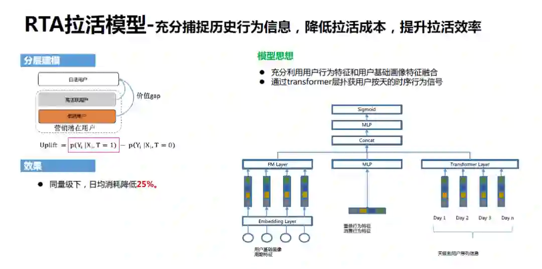 我们在对用户进行拉活增长时,对用户进行分层:营销潜在用户、低活用户、高活用户、日活用户。拉取用户时,考虑到广告的本身投放成本,我们更倾向于拉起业务的低活用户,而不是业务本身已经高活的用户,这样广告的投放价值才最大。uplift公式的定义是"进行广告投放后的用户拉起概率"和"不进行营销活动的用户拉起概率"的差值。通过这样的uplift model在DPA中进行拉活的操作,在同一个场景下,消耗降低25%。