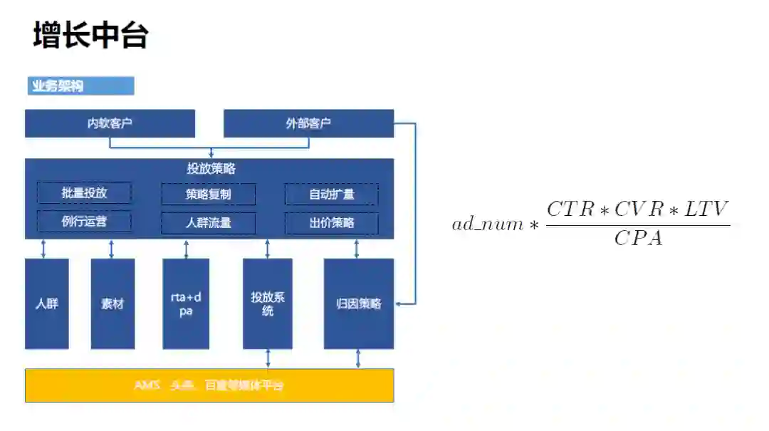 刚刚介绍了我们的增长中台在承接业务、用户增长、素材挖掘等方面的工作。回过头来总结下,我们的增长中台的大致业务框架如图。最上面主要是批量投放、策略的自动化复制以及自动扩量,从而提升广告的获量、获取外部的优质的流量。在模块例行运营、人群流量、出价策略、rta+dpa中,介绍了我们在CTR、CVR、LTV等价值增长中,ROI价值目标的达成策略。