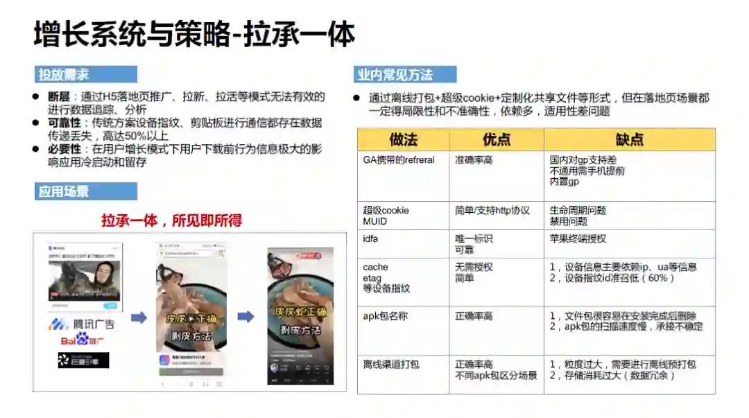 介绍完投放和素材的策略后,再介绍下拉承一体的策略。投放需求主要是通过H5落地页进行拉新、拉活时,无法有效进行数据追踪分析。同时投放过程中,用户的兴趣点到落地页承接的时候,行为信息是否一致。为了做到广告环节和承接环节的打通。业内主要的做法有用户标识、etag、apk包等方式。