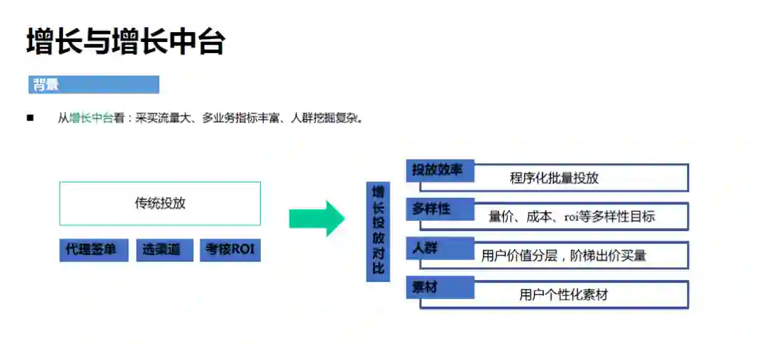 传统的增长买量过程,一般会联系多个代理商,通过代理商联系不同的渠道,根据不同的渠道设定考核ROI和预算。对于增长中台,会有更丰富的产品流量、业务指标和精细化的人群挖掘。投放效率方面,能够程序化的投放。业务目标,支持复杂业务在不同的阶段设定不同的考核目标。人群方面:根据前面提到的不同的大R、小R、激活、注册等,对人群进行价值分层,实现阶梯出价精细化买量。素材方面也实现个性化素材自动生成。
