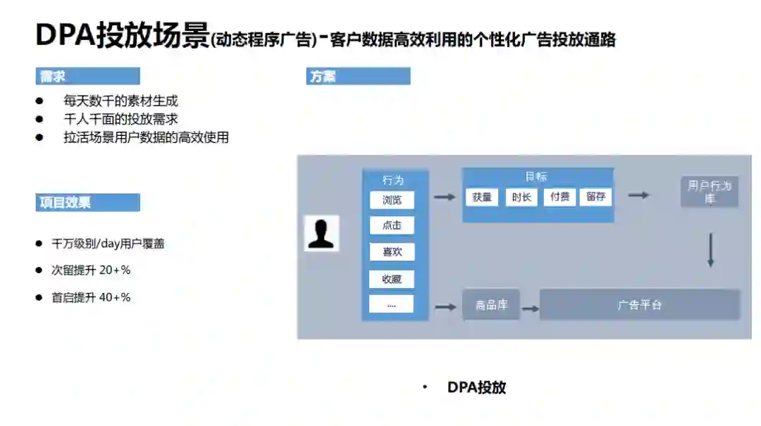 在买量和投放广告的过程中,素材的投放和编辑其实是比较个性化的环节。广告主每天会生成数千的素材,同时有千人千面的投放需求。DPA的场景是这样的,用户对一些APP会产生很多历史行为(浏览、点击、喜欢、收藏等),通过对这些行为的挖掘形成了一套商品库的体系;然后广告主设置投放目标(获量、时长、付费、留存等)后,会基于这些目标挖掘素材APP相关的用户行为库。不同的行为会对应不同的目标;商品库和行为库打通之后,可以做到不同的用户、不同的目标有个性化的素材呈现。在DPA投放场景中,做到了千万级别用户覆盖。主要是提高了用户的次留、时长和留存率。