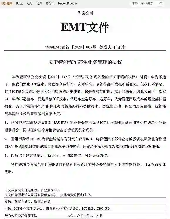 11月25日,华为内部网站公开了一封任正非亲自签发的EMT文件,正式确认了汽车业务和消费者业务合并一事。余承东出任合并后部门的IRB主任。文件特别强调了「不造车」的态度:谁提造车谁离岗!