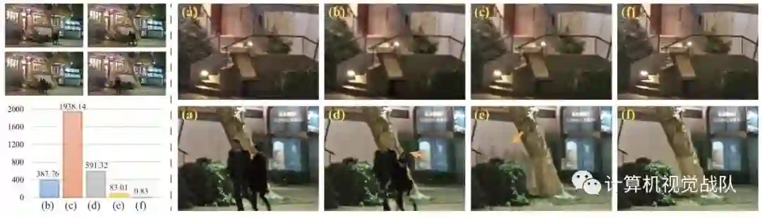 之前的运动估计通常依靠光流(逐点运功估计)或者块匹配(常用于视频压缩的运动估计)的方式。然而它们的计算非常耗时,并且结果容易受到噪声的影响。袁路所在的研究组对相机运动和被拍摄物体运动进行了拆分计算。首先,他们将相机的运动参数化,建立出一个参数模型,从而能非常快的估计出具体运动的相关参数。而针对场景中的物体运动,他们则对每一帧的具体运动进行了分析,针对运动的快慢,算法都能相应地估计出运动物体的精确轮廓。在每个像素时间轴上相加平均的时候,那些位于运动物体轮廓区域的像素都会被排除掉。通过这种简单的方式,他们能有效的解决图片每个像素对齐的问题。除此之外,他们进一步考虑空间上信息相关性,建立了一个多尺度“金字塔”结构,根据图像结构(例如,平滑区域和边缘)的分析,自适应的选择相应的平滑策略,从而达到进一步去除残留噪声的目的。最终,他们的算法将时间轴和空间轴结合在一起,在校正了每一帧的运动之后,得到的便是一幅清晰的图像。