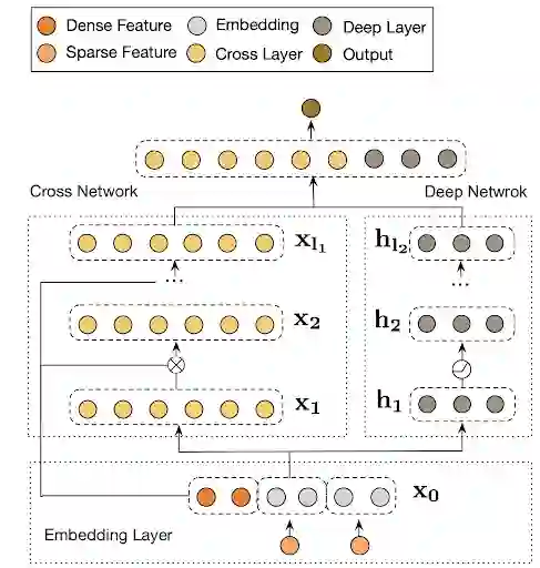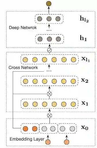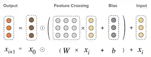 如果我们将 k个交叉层堆叠在一起,那么 k 层交叉网络将创建高达 k+1 阶的所有特征交叉,其重要性由权重矩阵和偏差向量中的参数来表征。
