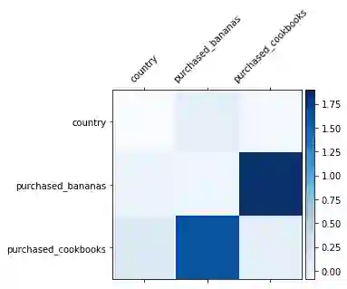 以向客户销售搅拌机为例。如果同时购买了香蕉和食谱是数据中最具预测性的信号,则 DCN 模型应能捕获这种关系。下图展示了包含一个交叉层的 DCN 模型的学习矩阵,该模型基于合成数据训练,其中联合购买特征的重要性最高。我们看到,在没有应用任何人工特征工程的情况下,模型自身已经学习“purchased_bananas”和“purchased_cookbooks”之间的交互具有很高的重要性。