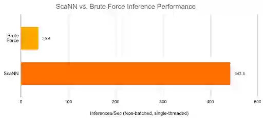 ScaNN 可以将大型检索模型提速 10 倍以上,同时仍能提供与暴力矢量检索几乎相同的检索准确率