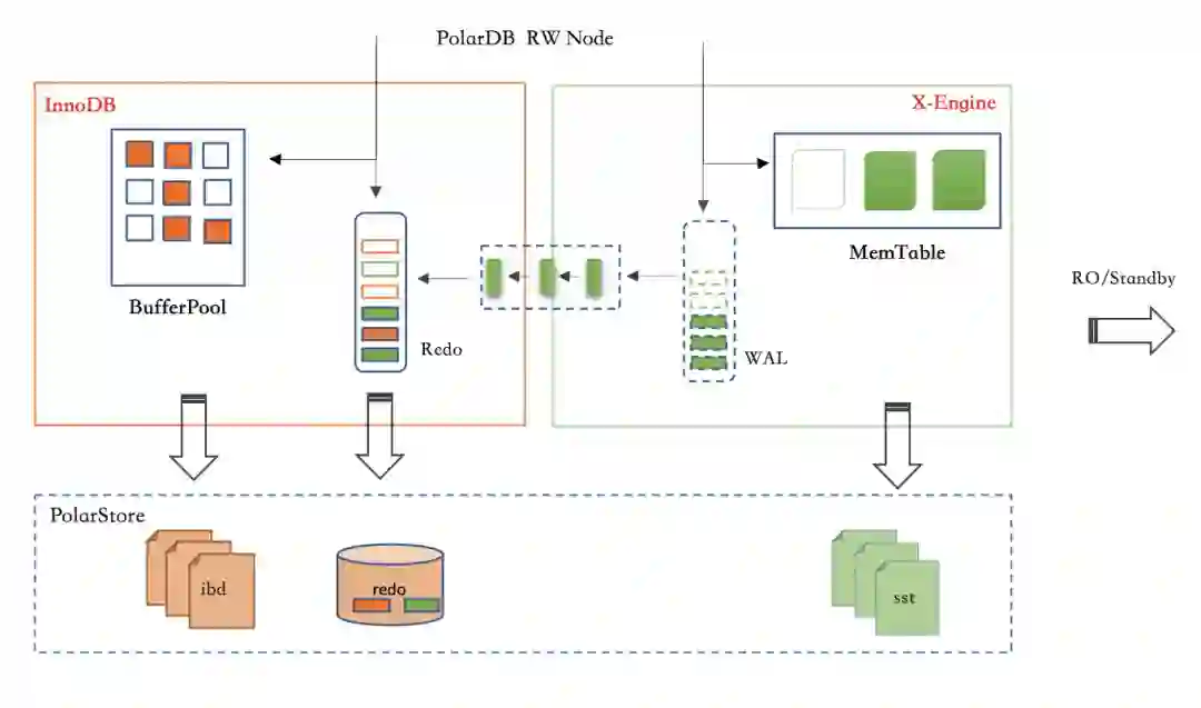 PolarDB支持X-Engine引擎后,X-Engine引擎与InnoDB引擎仍然独立存在。两个引擎各自接收写入请求,数据和日志均存储在底层的分布式存储上,其中idb文件表示的是InnoDB的数据文件,sst文件表示的是X-Engine的数据文件。这里最主要的点在于InnoDB与XEngine共享一份redo日志,X-Engine写入时,将wal日志嵌入到InnoDB的redo中,Replica节点和Standby节点在解析redo日志后,分发给InnoDB引擎和XEngine引擎分别回放进行同步。