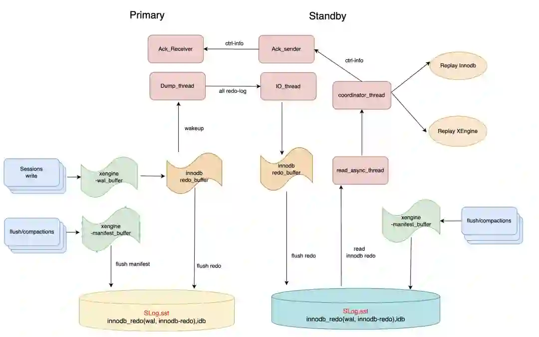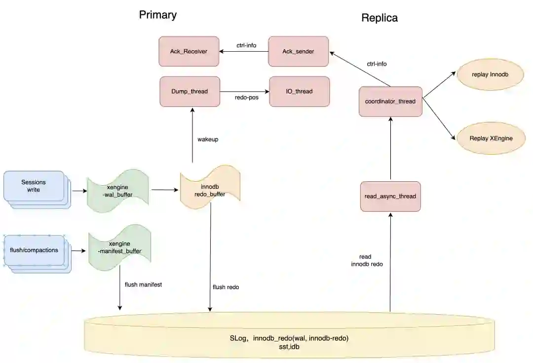 在InnoDB中有redo和undo两种日志,undo日志可以理解为一种特殊的“data”,所以实际上InnoDB的所有操作都能通过redo日志来保证持久性。因此,在进行复制时,只需要在主从节点复制redo日志即可。X-Engine引擎包含两种日志,一种是wal日志(WriteAheadLog),用于记录前台的事务的操作;另一种是Slog(StorageLog),用于记录LSM-tree形状变化的操作,主要指Compaction/Flush等。wal日志保证了前台事务的原子性和持久性,Slog则保证了X-Engine内部LSM-tree形状变化的原子性和持久性,这两个日志缺一不可,都需要复制同步。