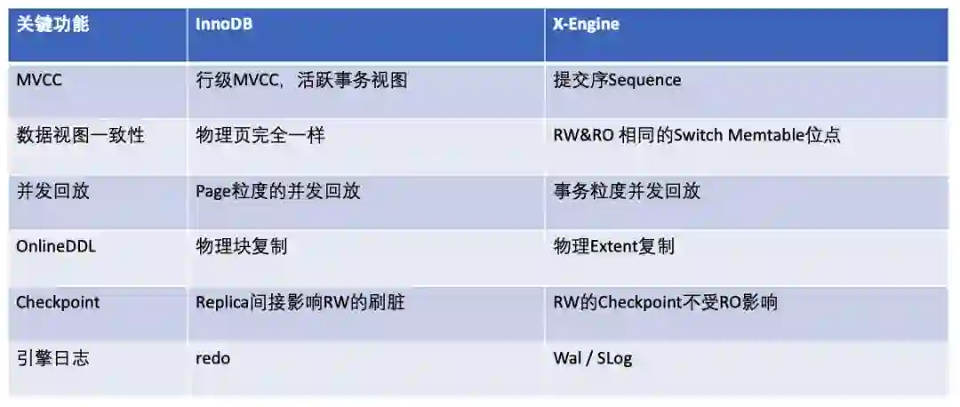上节我们详细描述了基于LSM-tree架构的存储引擎,实现一写多读所需要的关键技术,并结合PolarDB双引擎介绍了一些工程实现。现在我们跳出来看看基于B+tree和基于LSM-tree两种数据组织结构在实现技术上的对比。首先要回到一个基本点,B+tree是原地更新,而LSM-tree是追加写,这带来的区别就是B+tree的数据视图在内存和外存一个缓存映射关系,而LSM-tree是一个叠加的关系。因而需要面对的技术问题也不同,B+tree需要刷脏,需要有double-write(在PolarFS支持16k原子写后,消除了这个限制);LSM-tree需要Compaction来回收历史版本。在一写多读的模式下面临的问题也不一样,比如,B+tree引擎复制是单redo日志流,LSM-tree引擎是双日志流;B+tree在处理并行回放时,可以做到更细粒度的页级并发,但是需要处理SMO(SplitMergeOperation)问题,避免读节点读到“过去页”或是“未来页”。而LSM-tree是事务级别的并发,为了保证RW和RO节点“内存+磁盘”的一致性视图,需要RW和RO在相同的位点做Switch Memtable。下表以InnoDB引擎和X-Engine引擎为例,列出了一些关键的区别点。