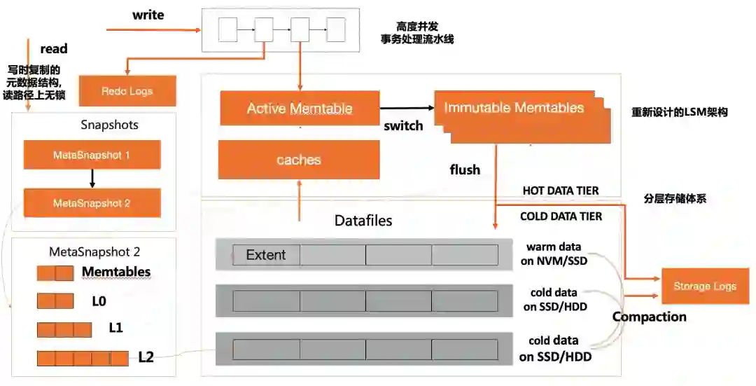X-Engine引擎采用LSM-tree结构,数据以追加写的方式写入内存,并周期性物化到磁盘上,内存中数据以memtable形式存在,包括一个活跃的active memtable和多个静态的immutable。磁盘上数据分层存储,总共包括3层,L0,L1和L2,每一层数据按块有序组织。X-Engine最小空间分配单位是一个extent,默认是2M,每个extent包含若干个block,默认是16k。数据记录紧凑存储在block中,由于追加写特点,磁盘上的数据块都是只读的,因此X-Engine引擎可以默认对block进行压缩,另外block中的记录还会进行前缀编码,综合这些使得X-Engine的存储空间相对于InnoDB引擎只有1/3,部分场景(比如图片空间)甚至能压缩到1/7。有利就有弊,追加写带来了写入优势,对于历史版本数据需要通过Compaction任务来进行回收。有关X-Engine的核心技术可以参考发表在Sigmod19的论文,《X-Engine: An Optimized Storage Engine for Large-scale E-commerce Transaction Processing》