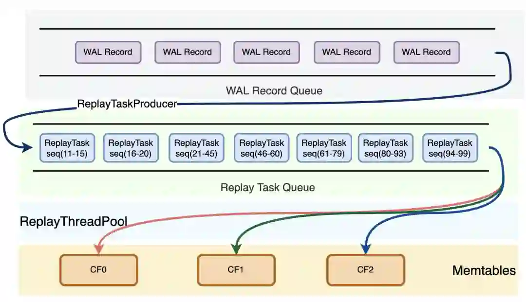 一写多读架构下,为了保证同一数据库实例的Primary、Replica、Standby三个角色的内存镜像完全一致,新增了一种SwitchMemtableLog,该Log Record在RW的switch_memtable过程中产生,因此RO、Standby不再主动触发switch_memtable操作,而是通过从RW上同步SwitchMemtableLog进行switch_memtable。SwitchMemtable操作是一个全局的屏障点,以防止当前可写memtable在插入过程中switch从而导致数据错乱。另外,对于2PC事务,并发控制也需要做适配。一个2PC事务除了数据本身的日志,还包括BeginPrepare、EndPrepare、Commit、Rollback四类日志,写入过程中保证BeginPrepare和EndPrepare写入到一个WriteBatch中并顺序落盘,因此可以保证同一个事务的Prepare日志都会被解析到一个ReplayTask中。在并行回放过程中,由于无法保证Commit或Rollback日志一定后于Prepare日志被回放,因此如果Commit、Rollback日志先于Prepare日志被回放,那么在全局的recovered_transaction_map中插入一个key对xid的空事务,对应的事务状态为Commit或Rollback;随后Prepare日志完成回放时,如果发现recovered_transaction_map中已经存在对应的事务,那么可以根据事务的状态来决定直接提交事务还是丢弃事务。