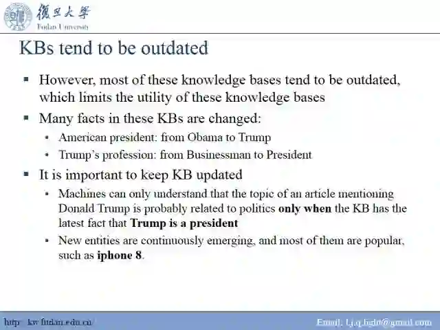 知识库中的知识并不是一成不变的,很多事实都会发生变化。例如,美国总统从奥巴马变成了特朗普;特朗普的职业从商人变成了总统。这样一来,知识图谱的更新就显得非常重要。如果不知道特朗普是总统,机器在阅读最新文章时,可能只会把他认为是一个普通商人发表的政治意见。还有很多新词,比如说iPhone8,你将永远不知道它是什么。
