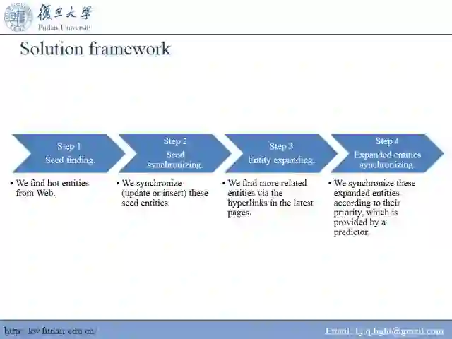 整体框架如下:首先监控热词获得种子实体,然后同步这些种子实体。接下来通过实体的相关实体来扩展得到更多的待更新实体,最后根据这些待更新实体的优先级来进行更新。