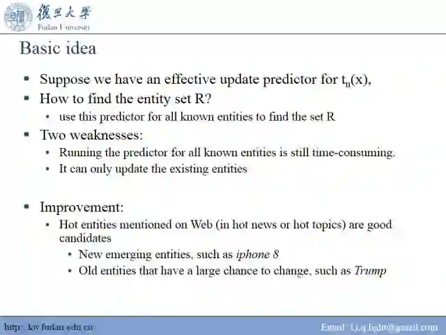 一个改进的方法是对互联网上的热词进行监控。因为我们认为,一个实体之所以变成热词,会有两个原因。一个是新词,比如即将发布的iPhone8。另一个是旧词,但知识发生了变化,比如说特朗普变成美国总统了。