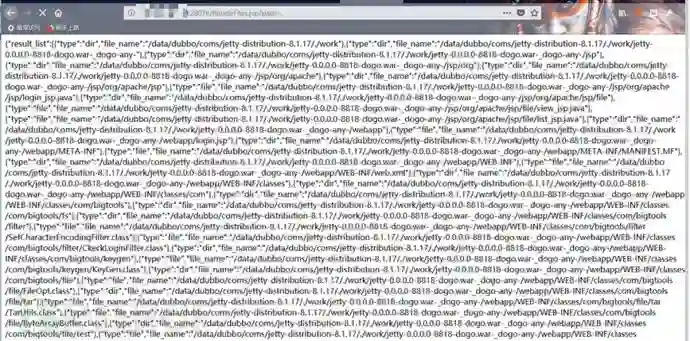 4、蒙了一下dirFiles.jsp的 参数,使用”path”作为参数名可列出目录、文件信息,URL:http://x.x.x.x:28076/file/dirFiles.jsp?path=。