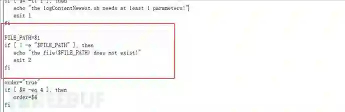 分析logContentNewest.jsp和 被调用的sh脚本,得知path参数最终会传入sh脚本的FILE_PATH变量,然后调用下面的判断逻辑。从下面代码我们可以看到,函数的功能是判断FILE_PATH变量的值是否存在,而这个变量的值目前是可控的。