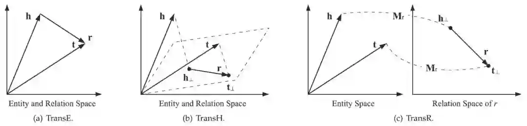 基于距离的翻译模型(distance-based translational models)。这类模型使用基于距离的评分函数评估三元组的概率,将尾节点视为头结点和关系翻译得到的结果。这类方法的代表有TransE、TransH、TransR等;