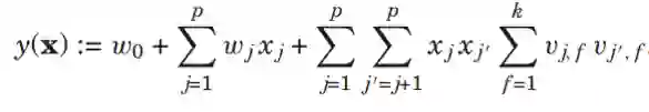 以LibFM[1]为代表的通用的基于特征的推荐方法(generic feature-based methods)。这类方法统一地把用户和物品的属性作为推荐算法的输入。例如,LibFM将某个用户和某个物品的所有属性记为x,然后令该用户和物品之间的交互强度y(x)依赖于属性中所有的一次项和二次项:
