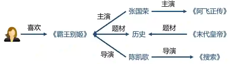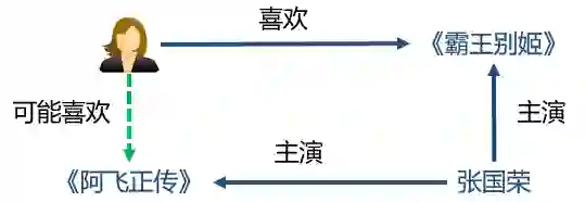 这里值得一提的是知识图谱和物品属性的区别。物品属性可以看成是在知识图谱中和某物品直接相连的一跳(1-hop)的节点,即一个弱化版本的知识图谱。事实上,一个完整的知识图谱可以提供物品之间更深层次和更长范围内的关联,例如,“《霸王别姬》-张国荣-香港-梁朝伟-《无间道》”。正因为知识图谱的维度更高,语义关系更丰富,它的处理也因此比物品属性要更加复杂和困难。