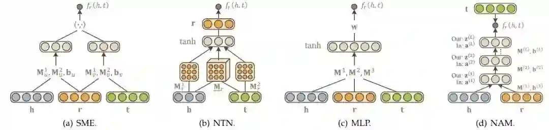基于语义的匹配模型(semantic-based matching models)。这类模型使用基于相似度的评分函数评估三元组的概率,将实体和关系映射到隐语义空间中进行相似度度量。这类方法的代表有SME、NTN、MLP、NAM等。