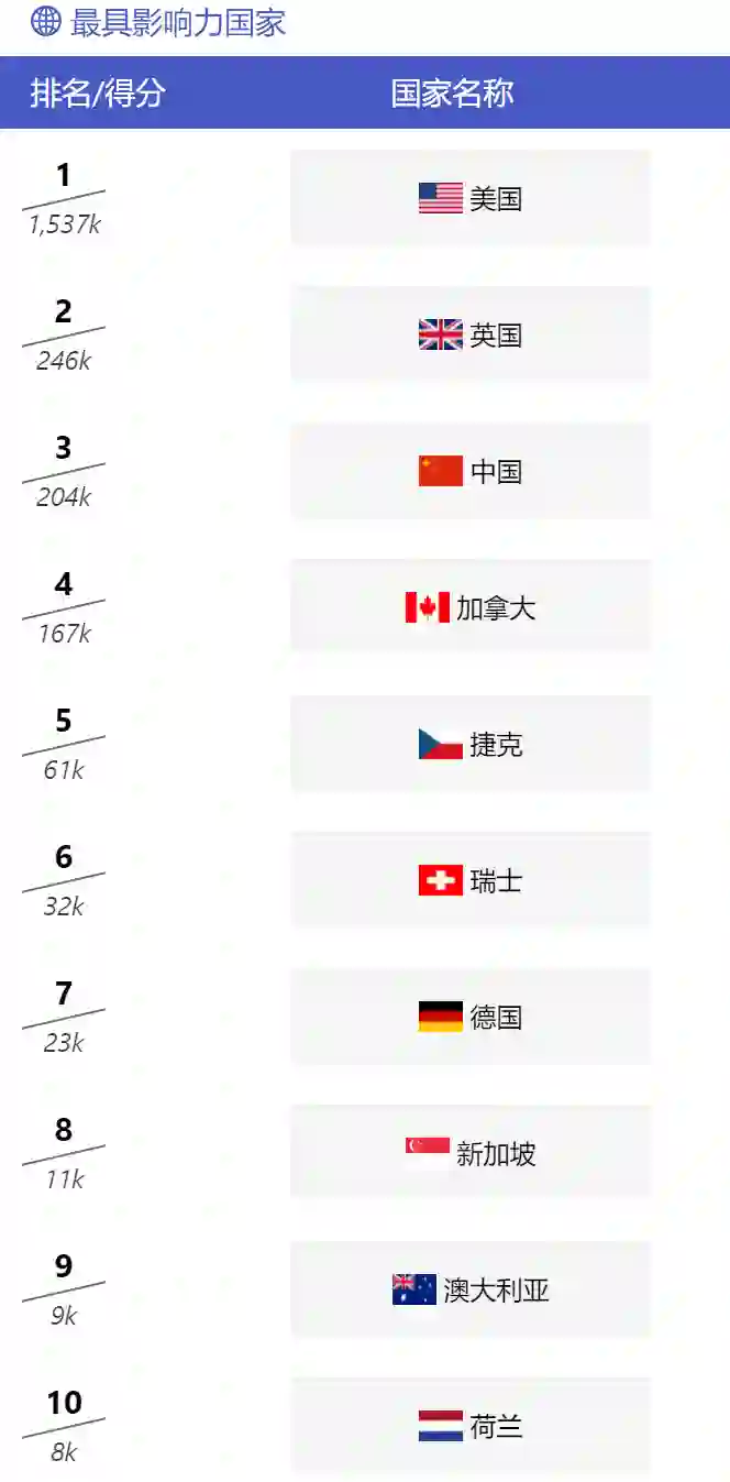 本年度 AI 2000 榜单提供了全景分析,力求在综合全领域数据的基础上对最具影响力学者进行展示和分析,并进行数据的二次解读。(https://www.aminer.cn/ai2000/play) 用户通过左侧“选择领域”勾选想要查询的领域,即可获取特定领域下的全球人工智能知识图谱,查看国家、机构、学者和论文 4 种实体的排名和之间的关联。而在综合排名前十的学者中,排名第一的学者是何恺明,任职于 Meta(原 Facebook);排名第十的学者是任少卿,任职于 NIO。另外值得注意的是,前十名的学者,仅有一位来自于高校,一位来自于研究机构,其余 8 位都任职于公司。在最具影响力机构前十名的排名中(见下图)也出现了科技公司占据上风的情况。由此可见,科技公司已经成为 AI 技术进步上的重要推进者,打破了以往理论与实践之间的隔阂。图:最具影响力学者前十名 图:最具影响力机构前十名 在最具影响力国家的排名中,美国依旧以绝对优势领先,评分远超于第二名的英国。中国以相对微弱的差距排名第三,紧随其后的是加拿大。 图:最具影响力国家前十名