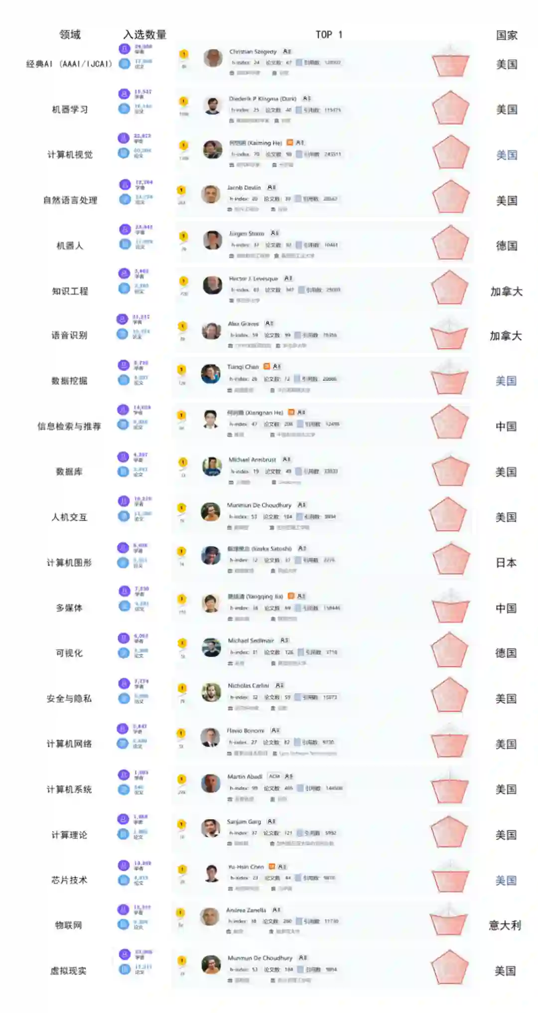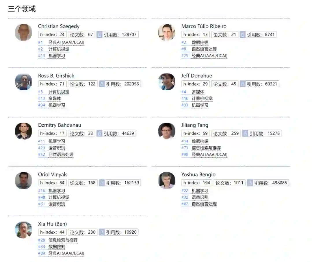 本届 AI 2000 上榜学者及提名学者中,有 95 位学者的研究方向涉及了多个领域并且取得杰出成果而上榜,占比 5%。其中,谷歌的 Christian Szegedy 在 3 个领域上榜(经典 AI 排名第 1、计算机视觉排名第 2 及机器学习排名第 13)并且排名都较为靠前。Christian Szegedy 的 h-index 值为 24,入选论文 67 篇,引用量 128707。虽然论文数量不多,但是引用量极高。在3个子领域上榜的还有 2018 年图灵奖得主、加拿大蒙特利尔大学教授 YoshuaBengio 。此外还包括两位华人学者,即来自密歇根州立大学的 JiliangTang 教授及来自德克萨斯农工大学的 Xia Hu 教授。此外还有 86 位学者在 2 个领域有杰出表现而上榜。 图:三个领域上榜学者名单