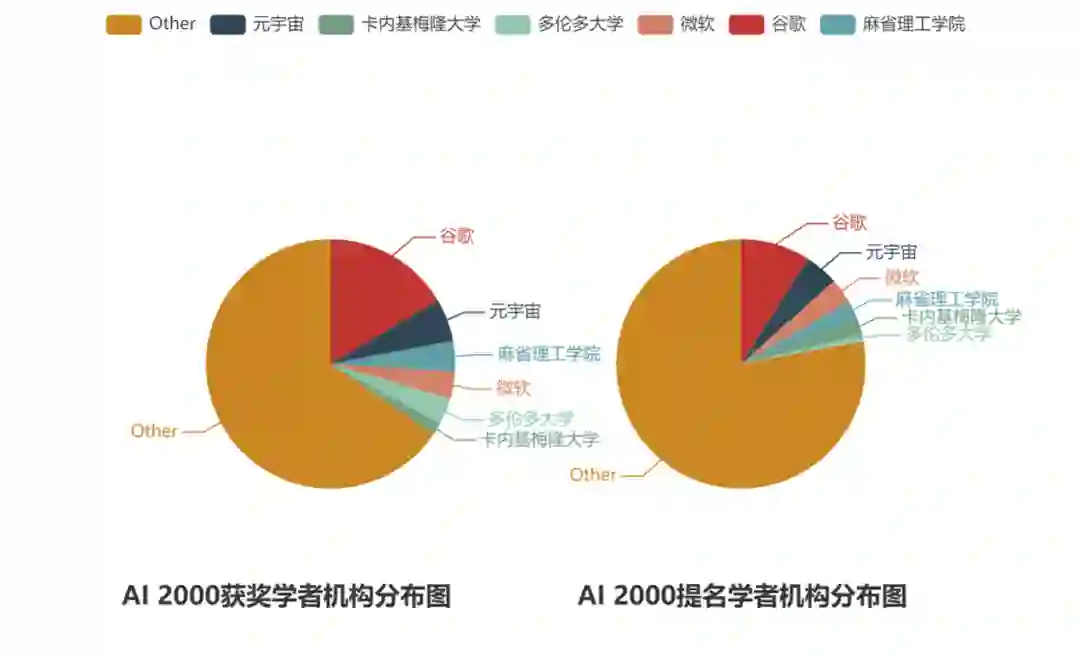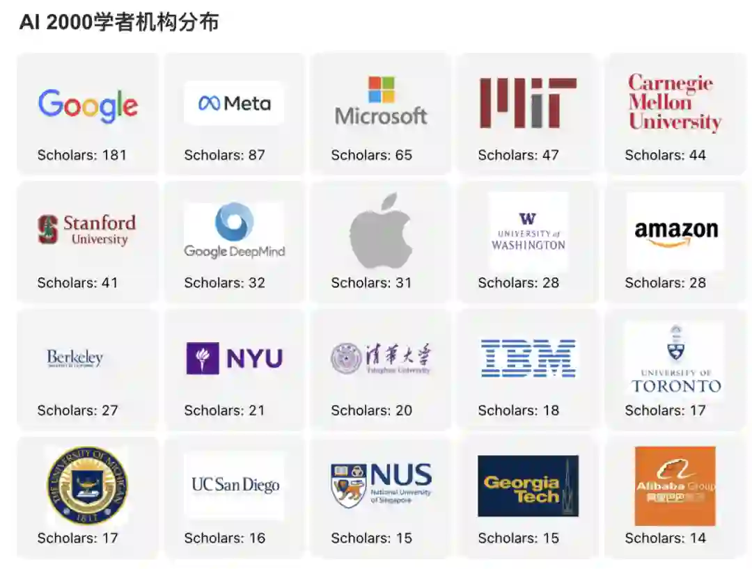 从 AI 2000 最具影响力学者入选数量来看,谷歌、Meta(原 Facebook)及微软三大科技公司占据优势地位,公司拥有的顶级 AI 学者数量,无论是 top 10 还是 top 100 数量,均远多于高校。其中位居首位的谷歌公司,共 181 人次入选榜单,也是唯一一家学者数过百的机构。从机构所在的国家分布来看,清华大学相较于去年,遗憾离开前十名的位置。前十名均为美国机构,且美国机构学者总体人数遥遥领先。阿里巴巴位列第二十位,相较于去年有所提升。 图:AI 2000 学者及提名学者机构分布图:AI 2000 学者及提名学者的机构分布图