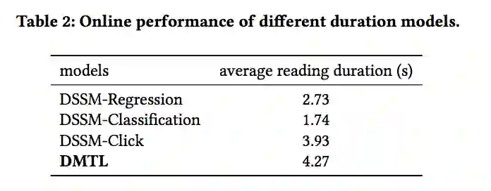 在线的ab实验用T / M(平均阅读时长)来评估,T 表示所有阅读时长的总和,M 表示所有曝光次数。可以看到在线表现和离线评估结果基本是一致的。其中比较特别的是DSSM-Classification的在线表现比DSSM-Regression更差。作者认为主要是因为缺乏对duration前置信息的建模导致线上预估不准,离用户真实兴趣相差较远。