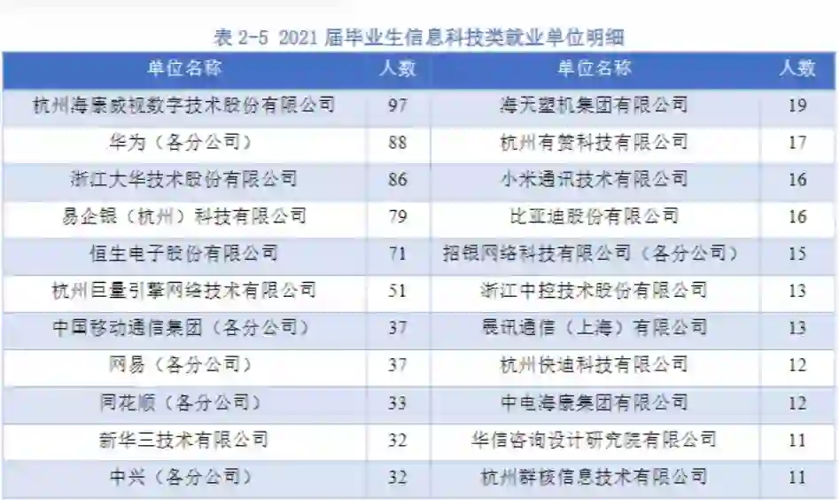 可能大家更关心的还是有多少人能进入大厂。数据显示,毕业生信息科技类就业最多的公司是海康威视、华为、易企银和恒生电子。全部都是国内知名企业。