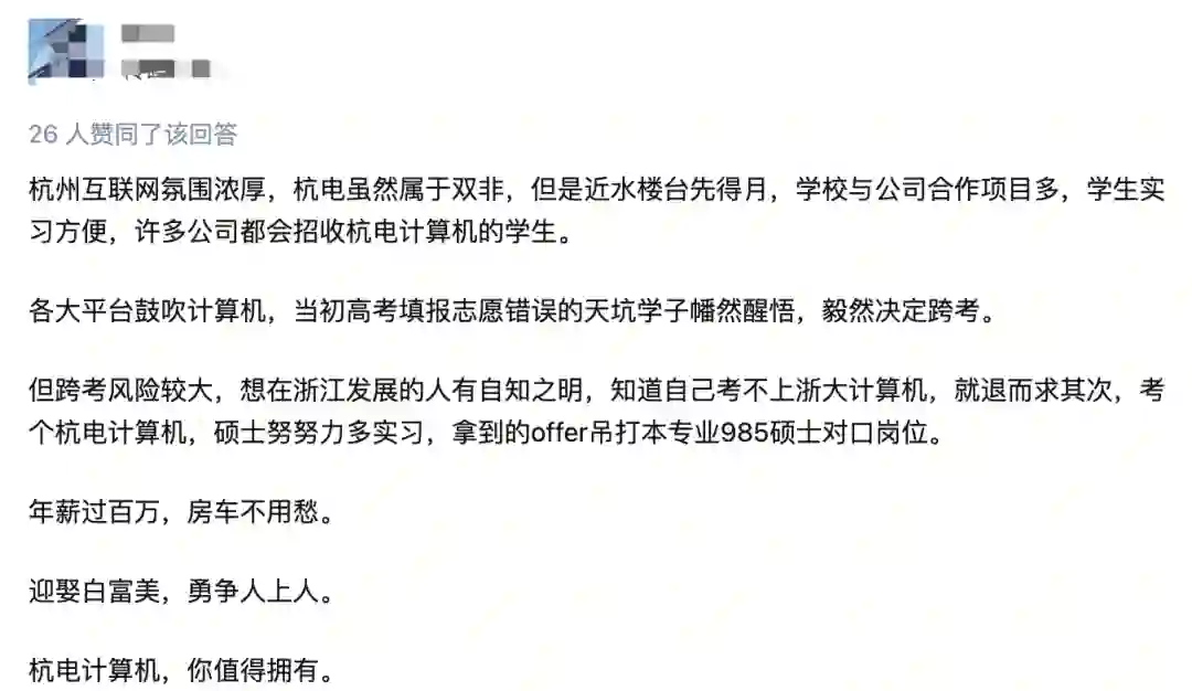 杭州互联网氛围浓厚,杭电虽然属于双非,但是近水楼台先得月,学校与公司合作项目多,学生实习方便,许多公司都会招收杭电计算机的学生。