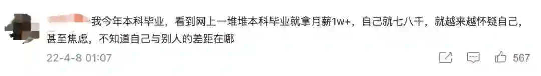 我今年本科毕业,看到网上一堆堆本科毕业就拿月薪1w+,自己就七八千,就越来越怀疑自己,甚至焦虑,不知道自己与别人的差距在哪。