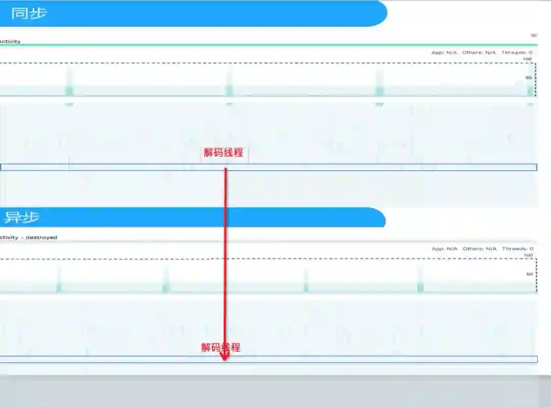 android平台上,硬解omx模块默认用的是同步调用模式。android9.0以下native层只提供了这种模式,会循环的进行queue/dequeue操作,cpu消耗较大。android9.0及以上,native层提供了omx的异步调用模式,会只在queue/dequeue完毕之后callback调用解码模块干活,所以cpu消耗比同步要小。如下图所示,异步比同步要明显稀疏一些。
