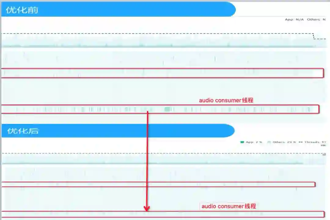 review发现audioconsumer线程cpu消耗比audio decoder多很多,不符合预期,检查发现当没有开启倍速情况下,也会走倍速相关的运算逻辑,导致cpu异常消耗,修复前后对比如下图: