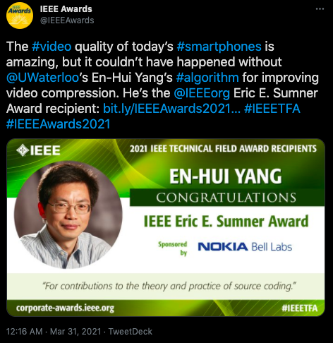3月31日,IEEE 宣布将Eric E. Sumner奖发给杨恩辉教授,以表彰他在视频压缩领域的贡献。