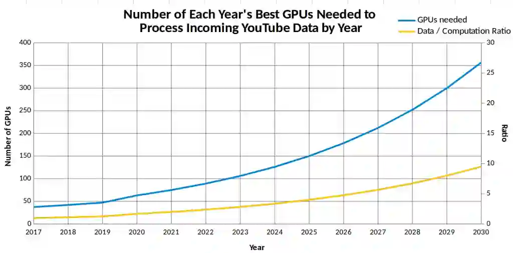 每年处理所有上传到YouTube数据所需GPU的数量(通过ResNet逐帧解决),以及数据和计算增长之间日益增长的差距。假设数据的增长频率是2年翻一倍,并且从2019年开始计算能力的增长的时间为3年和4年翻一倍。