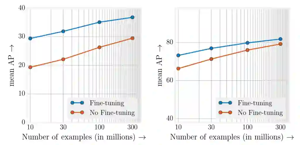 在JFT-300M的子集上进行预训练并在MS COCO上使用该预训练模型时,性能提高。左边是在training+0.8*dev set训练的结果,右边是只在 train set上训练的结果。图片来自论文:Revisiting Unreasonable Effectiveness of Data in Deep Learning Era