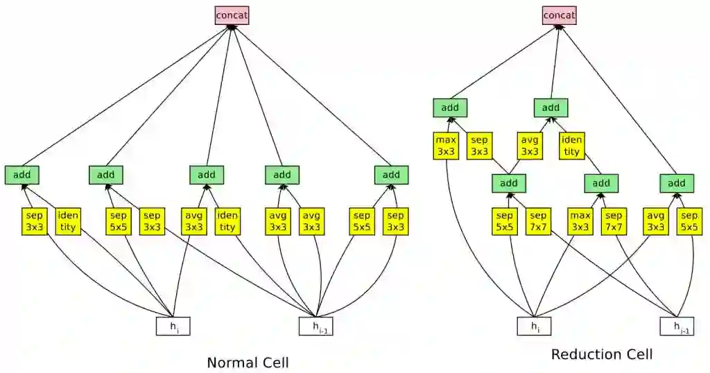 通过神经网络搜索(NAS)发现的架构令人印象深刻。最值得注意的是,网络从来没有选择使用标准的3×3卷积,虽然它完全可能这样做。相反,网络总是在常规卷积中选择可分离的卷积。另一个有趣的是使用平均池化。在这些单元格(或块)中,这是一个很常见的操作。还有一个令人震惊的事实,作者尝试手动添加到残差连接到最终块里,但这些残差连接降低了性能。