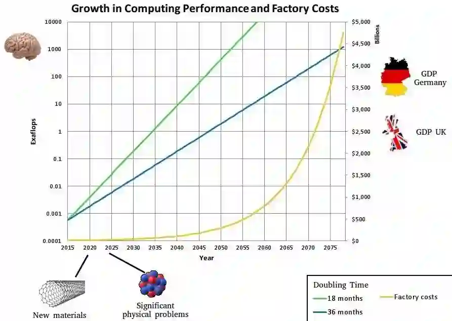 超级计算机的计算能力的翻倍的频率可能会在1.5-2年之间,同时增长的还有生产所需处理器的工厂的成本。2015年,计算增长翻倍是1倍,但是现在已经过时了。自2017年以来,计算力的翻倍时间可能会是3年一周期,所以,在本世纪内,将不会达到计算机的大脑极限。另外,在此之前,2025年左右,由于物理限制,计算增长可能会停滞。如果我们坚持冯 - 诺依曼式计算机,计算问题是不可避免的。