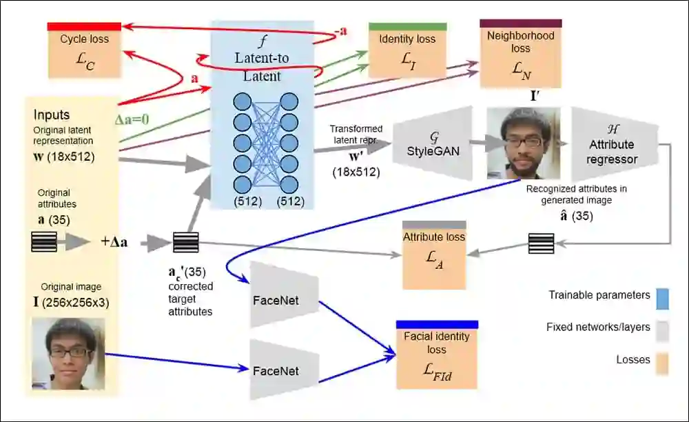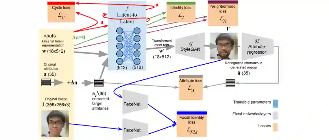 通过在整个生成pipeline上端对端训练网络,该系统可以适应现有的生成器架构的潜空间,并能够保护属性(Conservation properties),如人的身份特征可以在训练损失中进行编码。