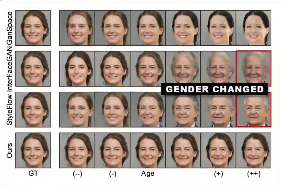 实验结果和预期相符,在其他竞争的模型架构中,图像合成的结果出现了更大程度的纠缠。例如,在一个测试中,当用户要求改变人物年龄时,InterFaceGAN和StyleFlow甚至把主体的性别都给变了。