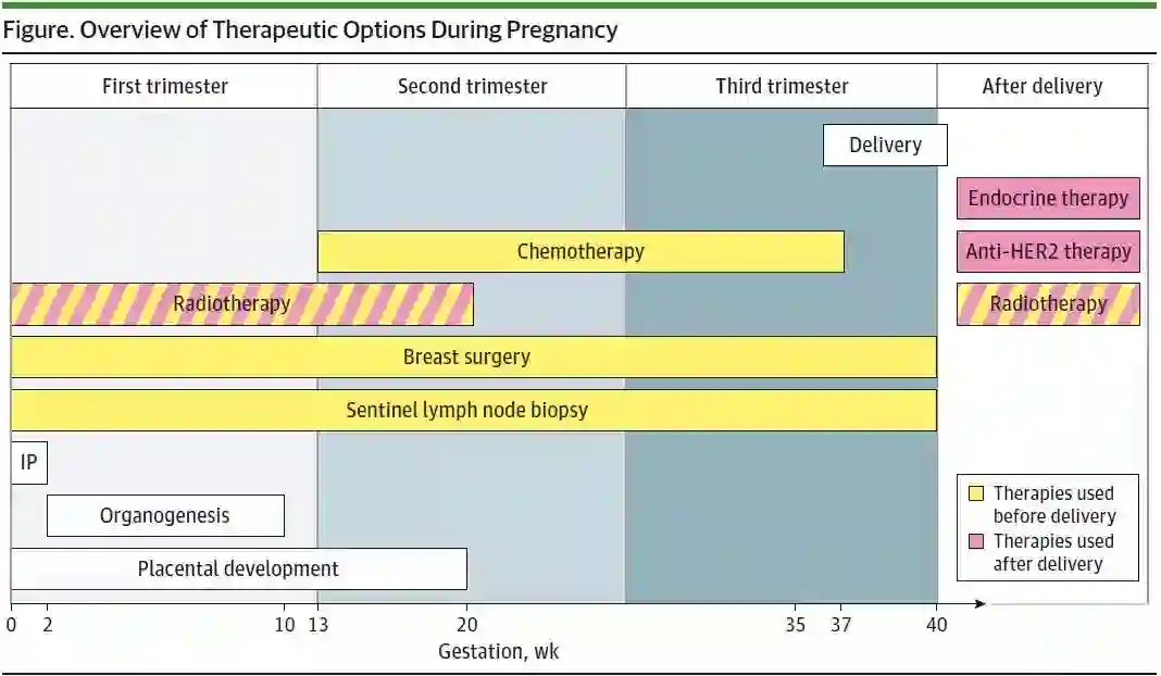 该患者同时存在特殊性,患者首诊时处于妊娠期,即妊娠期乳腺癌,对于妊娠期乳腺癌治疗应针对不同妊娠时期选择合理治疗。妊娠早期(孕周<12 周),细胞毒药物对胚胎的发育存在一定影响,因此细胞毒药物治疗应慎重,必要时可考虑推荐终止妊娠。妊娠中、晚期(孕周≥12 周)的患者可以在妊娠期进行安全的乳腺癌综合治疗,此阶段细胞毒药物对胎儿生长发育的影响较小。但是无论是曲妥珠单抗还是帕妥珠单抗,抗HER2治疗对整个妊娠期胎儿的安全性都没有证据支持,因此抗HER2靶向药物应用要慎重。具体治疗方案对妊娠期的影响及可行性如图4所示。但是临床实践中,对于身处妊娠期的乳腺癌患者,如何平衡胎儿健康与肿瘤治疗,基于指南和文献证据基础上,还需要慎重、综合考量。