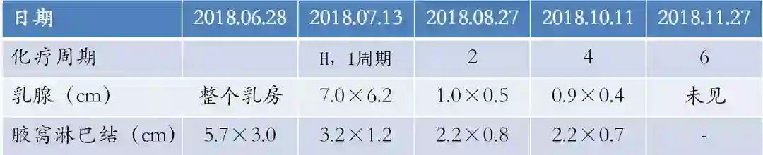 图2 患者化疗后右乳腺变化(从左到右依次为2、4周期治疗后和术前)