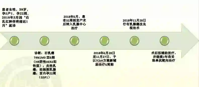 综上,该病例为HER2阳性型局部晚期乳腺癌,分娩后选择曲妥珠单抗联合细胞毒药物进行术前治疗,符合诊疗常规及指南推荐。同时患者具有“炎性乳腺癌”“妊娠期乳腺癌”等特殊情况,临床诊疗过程充分考虑患者情况选择个体化诊疗方案。