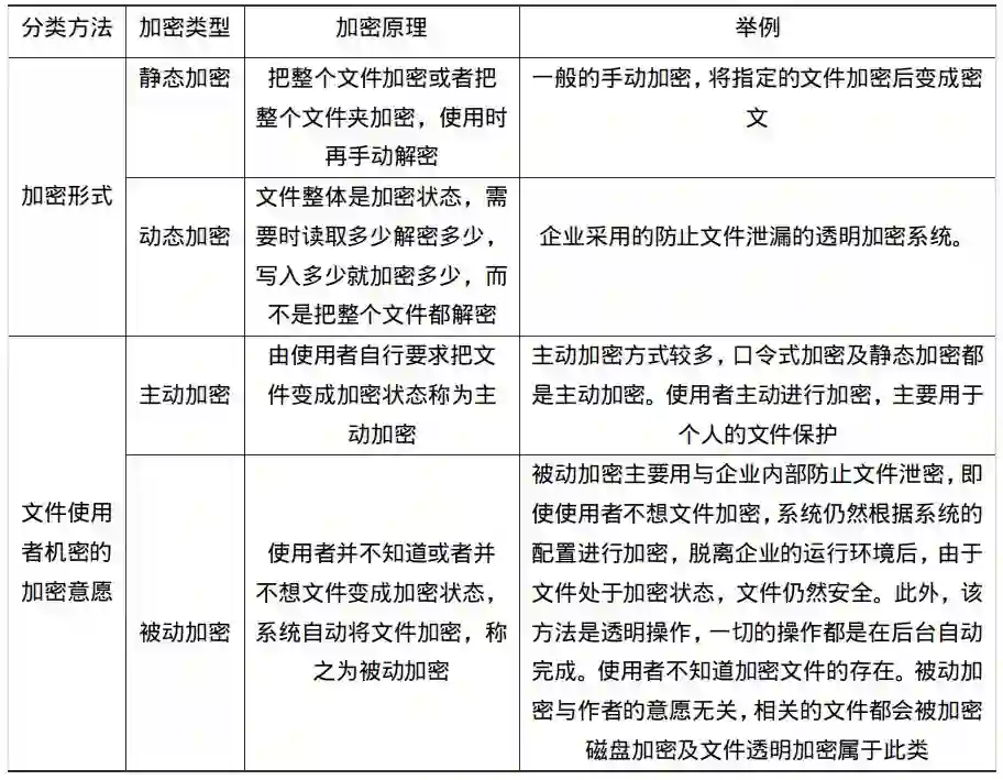 目前对于文件的加密主要有两种技术解决方案,一种是静态加密,是一种相对成熟的加密方案,是对整个文件及文件夹加密,使用时通过加密软件解密后使用,是一种主动加密,不具有可控性。另一种是动态加密,动态加密是一种使用时加密的技术,是在文件使用时加密,文件使用者并不知道使用的文件是加密的,故而又称为透明加密,动态加密对于使用者而言是被动的,无论如何文件都是加密的,是一种被动的加密技术,有很强的控制性,在企业文件保护控制中具有很强的实用性。下表列出了基本的加密技术分类、加密原理及实例。