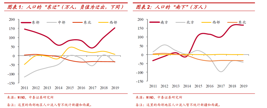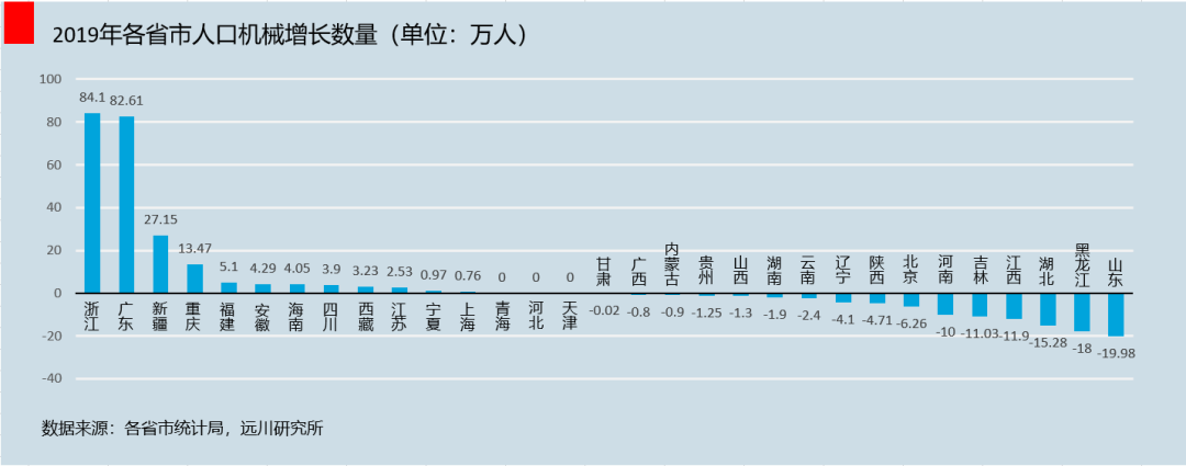 在以人口机械增长衡量的人口流动情况中可以清晰地看到,2019年浙江和广东人口净流入不仅位居前二,而且远高于其它省市。同时,在前十大人口净流入省市找那个,除了新疆与西藏之外,清一色为南方省份。
