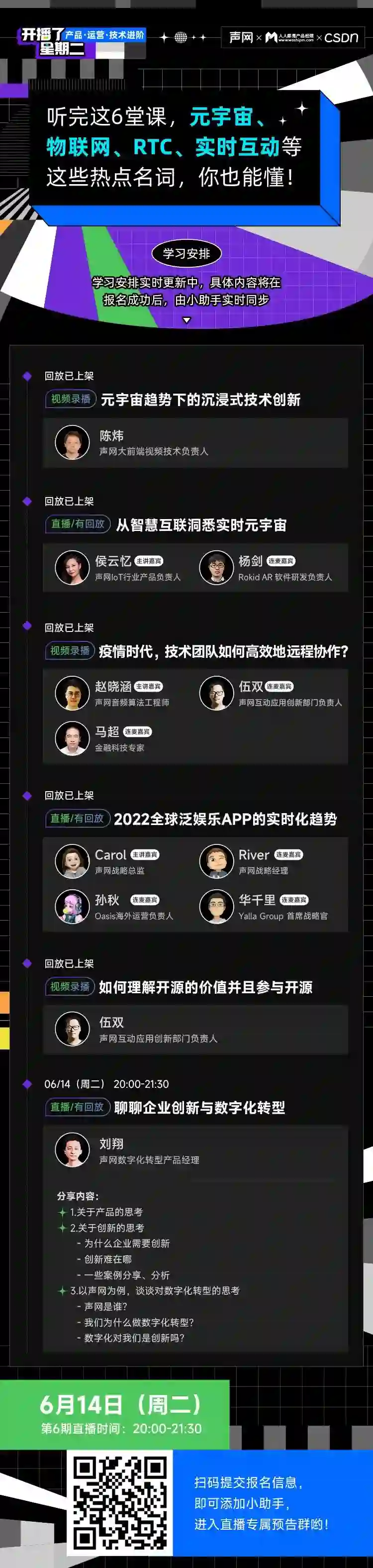 「开播了·星期二」知识分享栏目是由声网联合CSDN、人人都是产品经理共同策划,来自声网的技术专家、产品专家及神秘大咖嘉宾,从沉浸式技术创新、loT物联网、技术团队远程协作、虚拟社交背后的RTC应用、开源技术、数字化转型等六大主题内容,为广大同学带来不同视角、干货满满的深度分享。