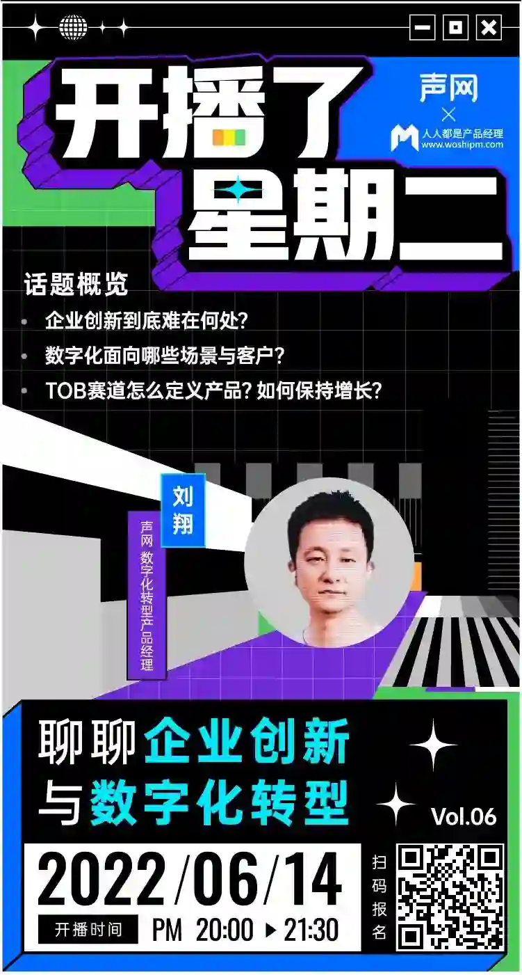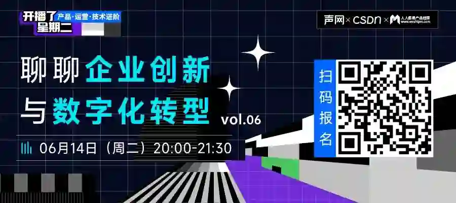 为此,6月14日 20:00,「开播了·星期二」第3期直播,我们邀请了声网数字化转型产品经理@刘翔,围绕企业创新和数字化转型的话题,聊聊一些具体的案例!
