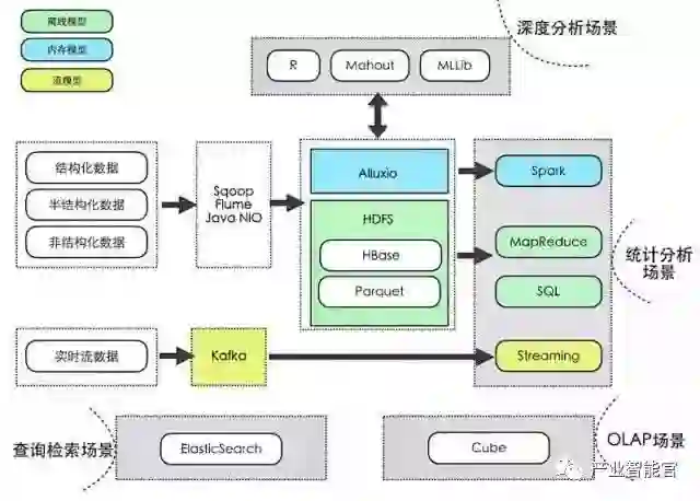 这幅图以查询检索场景、OLAP场景、统计分析场景与深度分析场景作为核心的四个场景,并以不同颜色标识不同的编程模型。从左到右,经历数据源、数据采集、数据存储和数据处理四个相对完整的阶段,可供大数据平台的整体参考。