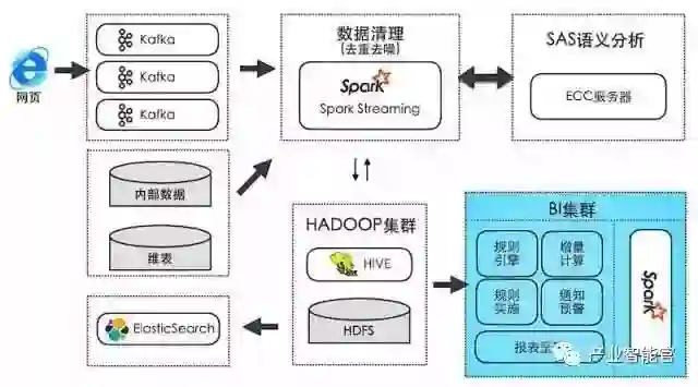 某厂商在实施舆情分析时,根据基于需求,与数据处理有关的部分就包括:语义分析、全文本搜索与统计分析。通过网络爬虫抓取过来的数据会写入到Kafka,而消费端则通过Spark Streaming对数据进行去重去噪,之后交给SAS的ECC服务器进行文本的语义分析。分析后的数据会同时写入到HDFS(Parquet格式的文本)和ElasticSearch。同时,为了避免因为去重去噪算法的误差而导致部分有用数据被“误杀”,在MongoDB中还保存了一份全量数据。如下图所示: